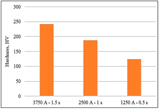 After the fusion occurs, during the cooling of the part, different areas are cooled at different rates in the HAZ. High cooling rates increase the likelihood of martensite formation. Therefore, in this study, the K-M equation was used to predict the formation of martensite and L-D equation to predict formation of pearlite structure in the HAZ region. It is observed from Figure 12 that increasing the heat input, current, and time of welding, causes a wider martensitic zone around the molten boundary. This is because as the heat input increases, wider areas of the HAZ become austenitic during the heating process. Then, during the cooling process, due to the high temperature of the HAZ, points with higher temperatures cool at a higher rate, therefore, more martensite forms in this region. It is worth mentioning, that by increasing the heat input, the percentage of martensite in the HAZ increases and pearlite decreases. Figure 13 shows the SEM images of the carbon steel HAZ welded with 2500 A and 1 s. In Figure 13A, it can be seen that the Martensite phase are visible along the melting boundary. In addition, in areas farther from the weld boundary, the pearlite phase, as shown in Figure 13B, is noticeable. There seem to be a proper accordance between the experimental and simulation results. Figure 14 shows the diagram of hardness in HAZ of three different samples. It is observed that at higher current and time, in fact higher heat input, the hardness is increased in HAZ. By observing and comparing the results of hardness with the results obtained from simulation, it is possible to validate the results of microstructure prediction once again.