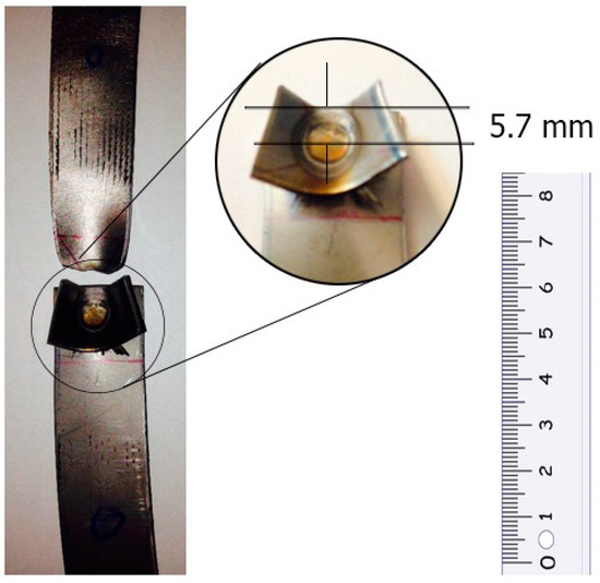 Fractured RSW sample during shear tensile test, 2500 A, 1 s.