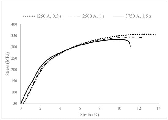By performing the shear tensile test, according to Figure 15, it is observed that during the shear tensile test, failure occurs from the weld boundary area of carbon steel, where martensitic transformation occurs in HAZ. In fact, according to Lan et al.’s [31] work, in the martensitic regions of the weld edge in carbon steel, the presence of micro cracks and cleavages cracks causes the structure to become brittle, and under shear stress, these cracks grow and failure occurs. Figure 16 shows the stress–strain diagram obtained from the shear tensile test of the samples welded by the RSW method. It can be seen that the maximum ultimate shear tensile stress of the welded sample is the 1250 A and 1 s and is higher than other samples. The reason for this is the lower amount of martensite formed in the HAZ of carbon steel. This also confirms the results of microstructure prediction.