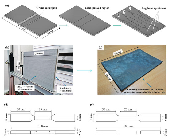 (a) Manufacturing steps of the repair tensile specimens; (b,c) manufacturing of the fully CS Ti6Al4V plate for extracting specimens for mechanical testing from 8.5 mm thick CS Ti6Al4V deposited on Al 5083-0 substrate, (c) a fully CS Ti6Al4V plate after removing the substrate; (d,e) dimensions of tensile specimens: (d) repair ratio 2:5, (e) fully CS.