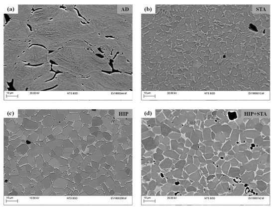 - HIP followed by STA (HIP + STA): Several studies reported that HIP temperatures can coarsen α platelets, causing a reduction in tensile strength of the material. Therefore, to recover the strength of the material, STA treatment is generally performed after HIP [27,28]. Parameters used for HIP + STA treatment was the same as mentioned earlier for STA and HIP.