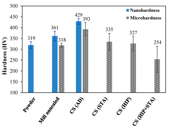 - STA and HIP treatments lowered hardness by 15–17% due to microstructural softening in the CS deposits caused by static recovery mechanisms during high-temperature thermal treatments.
