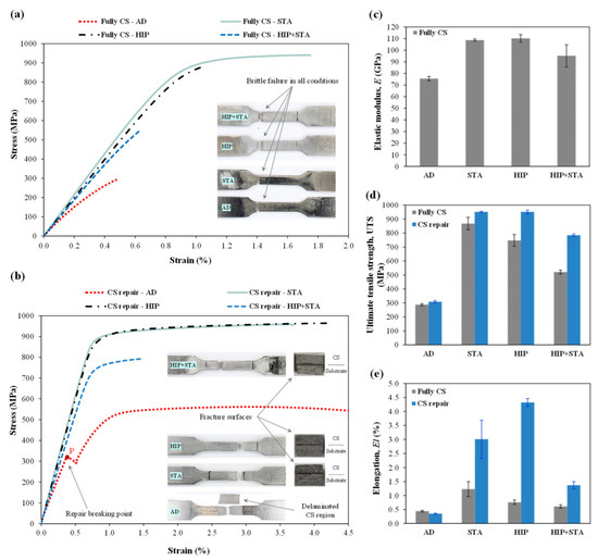 Tensile properties in four different conditions, i.e., AD, STA, HIP, and HIP + STA: (a) fully CS specimen: stress–strain curves, (b) CS repair specimen with 2:5 repair ratio: stress–strain curves, comparison among (c) elastic moduli of fully CS material calculated from the stress–strain curve, (d) ultimate tensile strength, and (e) elongation.