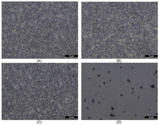 (A–C): the OM microstructures of grades of Table 1: A1 (WC-6Co), B1 (WC-9Co) and C1 (WC-6CoRu), respectively; (D): distribution of γ-phase (HfC) in grade D1 (WC-6CoHf).