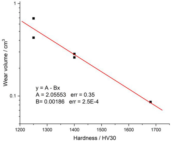 The wear volume V has been correlated with Vickers hardness H with the linear relationship proposed in Gant et al. [34]:
