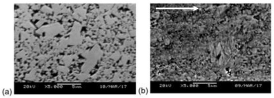SEM micrographs of grade C of Table 1: (a) pristine surface, (b) after abrasion test (the arrow shows the friction direction).
