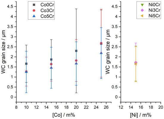 Mean WC grain size, evaluated by the linear intercept method [37]. For details of the samples, see Table 2.