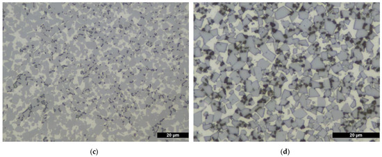 Cr addition, keeping the content of the main component of the metallic binder constant, progressively increases the hardness (Figure 5a), always exhibiting a parabolic dependence [4,35]. The Ni-base grades obey a similar behaviour, highlighting a continuous increase in hardness with the increase of the Cr addition, even if the specific increment seems to be smaller. Furthermore, Ni-base grades show hardness values that are significantly lower than those of Co-base ones. The abrasion results of the investigated grades—complied in Figure 5b—are coherent with the expected correlation with hardness values (Figure 5a): the amount of removed mass in each sample is inversely proportional to the hardness value. The same behaviour was also found for Ni-base grades, opening up the possibility of optimizing the choice of the most performing grade for applications where abrasion–corrosion conditions have to be faced. Figure 6 shows the results of the grain-size evaluation by the linear-intercept method. In spite of a quite large distribution, the mean values of grain size are consistent with a direct relationship with hardness and abrasion resistance. The hardening effect of the metallic binder alloy, resulting from Cr dissolution, cannot be definitively pinpointed on the basis of the available data alone and would require micro- or nano-indentation measurements on the phase. Nevertheless, one can notice that, as expected, in spite of the lower hardness, the mean WC grain size values of Ni-base grades are comparable to those of the Co-base ones with the same binder content. This result suggests that the Ni-base binder exhibits a lower hardness. As shown in Figure 7, in the 20 m% Co-base composition, Cr-additions to the binder which are larger than 5 m% cause the precipitation of free-C (Figure 7a, addition of 8 m% Cr). Moreover, for still higher Cr additions, both free-C and sub-micron Cr carbides (Figure 7b–d) are found, that, according to [25,36], should be M7C3. This result is also in agreement with calculations reported in [36]. The free-C precipitation could be caused by C availability from Cr3C2. The addition of 0.8 m% Cr as Cr3C2 in a 20 m% Co grade, assuming that Cr is fully solubilized, means about 0.25 m% free-C availability over the whole composite. In Ni-base compositions, free-C precipitates appear with 8 and 10 m% Cr (Figure 8a), while Cr-carbides appear in the case of 12 and 15 m% Cr additions (Figure 8b), as shown by EDS (Figure 8c).