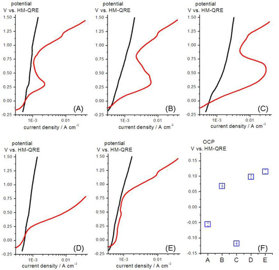 (A–E) LSV curves measured in tap water (black plots) and NaCl 0.6 M (red plots) of the grades listed in Table 1. Scan rate: 1 mV s−1. (F) Open circuit potential (OCP) values measured in tap water.