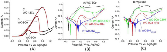 On the basis of the ranking of anodic performance with respect to Cl− content, we undertook a detailed study of the impact of binder compositional variations. Since the aggressiveness of Cl− tends to smooth out subtle aspects of anodic response, we selected neutral 0.5 M Na2SO4 as the test electrolyte for this purpose. The results of the OCP and LSV measurements for grades A1–E1 of Table 1 are given in Table 5 and Figure 10. Coherently with the relative nobility of Co and WC, it can be noticed that the amount of Co in the binder systematically anticorrelates with the electrochemical nobility of the grades. Noble Ru increases the nobility of the corresponding WC-Co grades by ca. 0.2 V, while baser Hf lowers the OCP value by ca. 0.1 V. The use of alloyed Ni (IN738LC superalloy) as the binder of WC results in the noblest grade of those investigated. The LSV curves show a critical impact of the binder chemistry on the PP behaviour. Figure 10 clearly shows the extension of the active range brought about by increasing the amount of Co. Panels (B) and (C) prove that alloying Co with either Hf or Ru leads to an improvement in corrosion performance: the latter, nobler alloying element affords a more effective protection. It is worth noting that the grade with the alloyed Ni binder exhibits a remarkable corrosion resistance. The measured LSV were fitted with the models described in Section 2.5.2: the resistivity model (Section 2.5.2) was found to yield better matches with experimental data and was selected for systematic fitting work. As commented in Section 2.5.2, we were mainly interested in following the PP behaviour of CC grades and for this reason the transpassive region was not followed by the fit. In particular, the corrosion current of the bare material was able to be quantitatively extracted using this model and was used to define the effectively removed PPF fraction (see Section 2.5.2 and Section 3.3.1 for details).