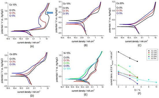(A–E) LSV curves for the indicated Co- and Ni-base hard metal grades with Cr additions, in Na2SO4 0.5 M aerated aqueous solution (scan rate: 1 mV s−1). (F) The current density at 0.9 VAg/AgCl for the investigated grade (i.e., the potential corresponding to the anodic end of the PP potential range of the Cr-free Co 10% grade, see grey arrow in Panel (A)).