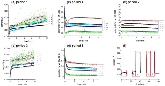 Electrochemical transients corresponding to the onset of abrasion or to the injection of chemicals for the grades A–E, as detailed in Table 1. The electrochemical testing of the different grades was carried out using the following potentials: A, 0.70 VHM-QRE; B, 0.80 VHM-QRE; C, 1.0 VHM-QRE; D, 0.90 VHM-QRE; and E, 0.75 VHM-QRE. (a,b) Onset of abrasion in tap water; (c) NaCl injection during abrasion; (d) onset of abrasion in the presence on NaCl; (e) hexane injection. Scatter plots correspond to experimental data, continuous lines are best fits. Panel (f) shows the collocation of the transients displayed in Panels (a–e).