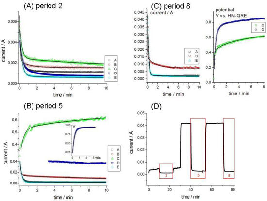 Electrochemical transients corresponding to the interruption of abrasion. (A) Tap water; (B) in presence of NaCl, since grade D undergoes a shift from galvanostatic to potentiostatic control during relaxation (see text for details), the potential transient is shown in the inset; (C) in presence of NaCl and hexane. Scatter plots correspond to experimental data, continuous lines are best fits. Panel (D) shows the exact collocation in the time of the transients.