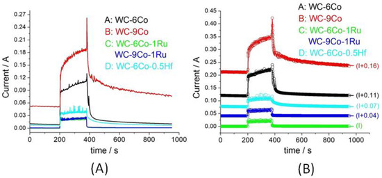 To deepen the understanding of the impact of binder composition on abrasion–corrosion, beyond the ranking proposed above in this section, we carried out a detailed study of the effect of Ru and Hf as well as of Co-binder content (specimens A1–D1 of Table 1). As already discussed in the case of pure corrosion, the impact of Cl− is so strong that subtle material effects can be better appreciated with a Cl−-free electrolyte: again, we selected 0.5 M Na2SO4. In this case, in which sensitivity to mechanical action is more important than to electrochemical attack, the abrasion–corrosion tests were performed with the following sequence: the total duration of the abrasion–corrosion test (10 min) was divided into three intervals, two of 3 min and one of 4 min. At the beginning and at the end of each test and between successive rotation periods, 10 min relaxation periods were allowed in order to follow the restoration of PPF. During the test, a potentiostatic (+0.5 V) current was recorded. This potential was chosen as representative of PP conditions for all the investigated grades immersed in 0.5 M Na2SO4. The results of the potentiostatic measurements are shown in Figure 15. The impact of the presence or absence of the abrading action on the corrosion current is pretty obvious, as well as the fact that the individual grades exhibit notably different dynamic responses. The common qualitative aspects of the abrasion transient are of course dictated by the removal of the PPF upon inception of the wheel rotation—yielding a current increase—and by its reformation upon cessation of abrasion, resulting in a current relaxation to values that are typical of the PP voltammetric range. In order to obtain quantitative information, the current transients were again elaborated according to the method expounded in Section 2.5.3: the extracted time constants are listed in Table 7, together with the computed removed effective PPF fraction RPP. From the comparison of data in Table 6 and Table 7, a clear correlation emerges between Vickers hardness and the RPP, τ↑1 and τ↑2 parameters extracted from the abrasion–corrosion measurements, while τ↓1 and τ↓2 seem to depend exclusively on the nature of the material. In particular, RPP and τ↑1 are anticorrelated with HV, while τ↑2 is positively correlated. The negative correlation between HV and τ↑1 can be explained by considering that, in the materials considered in this study, the harder materials are also the more corrosion-resistant, as a result of the chemical action of the additive. In fact, the PP currents of Figure 10 and the current values before abrasion inception in Figure 15 perfectly correlate with hardness. Since better PPFs are also thinner, they are more quickly removed by the abrading action. The positive correlation of HV and τ↑2 simply depends on the fact that the resistance of the grade to mechanical damaging is better for the harder materials. The positive correlation of HV and RPP, results from the synergy of high corrosion resistance and lower wear rate of the harder grades. As far as the bi-exponential current decay is concerned, it can instead be observed that τ↓1 and τ↓2 are notably faster for the Ru-containing grades, with decay rates correlating positively with the fraction of Ru in Co, suggesting that the noble element improved the repassivation ability. Concerning Hf, it exhibits the longest τ↓1 value and an intermediate τ↓2 one, while among the WC-Co grades, faster repassivation is found for the higher-Co grade, possibly owing to a faster corrosion product release. It is worth noting that, upon varying the nature of the binder, apart from the case of the Hf-containing grade—which contains a secondary phase—τ↓1 and τ↓2 vary in the same direction, suggesting that in binders containing the alloying element in solid solution, the PPF formation and growth rates are controlled by the same process.