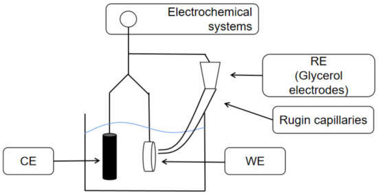 The instrument used for the experiments was a Princeton PARSTAT 4000 electrochemical workstation manufactured in the US. The electrochemical tests were performed using an electrochemical system with a typical three-electrode system, with a saturated glycerol electrode as the reference electrode (SCE) and in contact with the solution through a Login capillary; the counter electrode was a graphite rod electrode. The test metal was embedded in the holder as the working electrode, and the actual working area was 1 mm2. The metal was left for about 30 min, and then the open circuit potential was stabilized for the dynamic potential polarization and impedance test. A schematic diagram of the device is shown in Figure 2. The WE was the main object of electrode research and manipulation, the RE was the standard of comparison for potential electrodes, and CE was mainly based on the polarization of electrodes using polarizing currents.