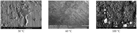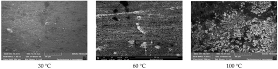 Figure 4 shows the microscopic morphology at different temperatures, total pressures (20 MPa), partial pressures of CO2 (0.6 MPa), and partial pressures of H2S (0.12 MPa). The condition of the proportion of H2S was high, where the surface experienced a slight corrosion at 30 °C, and there were no corrosion products attached, and no formation of corrosion pits was found. In contrast to this, the surface experienced local corrosion at 60 °C, resulting in the formation of some micro-corrosion pits, while the surface showed some serious corrosion at 100 °C, resulting in the formation of large number of corrosion pits, which was related to the high content of H2S.