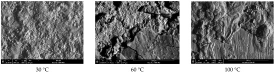 Figure 5 shows the microscopic morphology at different temperatures, total pressures (32 MPa), partial pressures of CO2 (0.96 MPa), and partial pressures of H2S (3.2 × 10−3 MPa). We observed that the metal surface underwent local corrosion at 30 °C, which was not uniform, but that there was an obvious large portion of uncorroded table-like areas on the surface, indicating that, in the presence of lower CO2 and H2S concentrations, the metal was subject to less erosion. Similarly, the metal surface was affected by more serious corrosion along with the presence of uncorroded table-like areas at 60 °C, indicating the limited erosion of the metal. However, the metal surface experienced severe corrosion, and corrosion products were deposited less uniformly but more densely at 100 °C. At the same time, the metal surface also experienced a certain amount of product shedding, and the surface product layer also faced a certain amount of cracking, which was related to the elevated concentrations of ions in the medium.