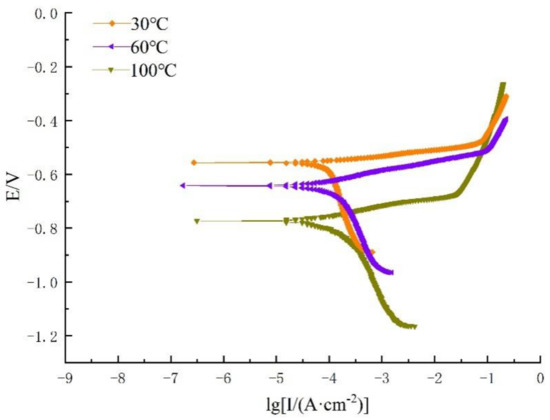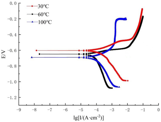 As can be seen in Figure 8, when the content of Na2S.9H2O in the medium was 3%, the cathodic branch of the polarization curve had a similar shape, and the overall movement was in the negative direction of the X-axis, compared with Figure 7, when the medium contained 0.3% Na2S.9H2O, which mainly involved the effect of the reduction reaction between H2CO3 and H2S (Figure 8). For the anodic polarization reaction, the anodic polarization branches at 30 and 60 °C had similar shapes, and the current density increased with the increase in potential. When the temperature increased to 100 °C, the anodic branch of the polarization curve underwent a significant change and an obvious passivation zone appeared, at which time the change of current density with potential was extremely small, which was because HS− in solution was instantaneously adsorbed on the metal surface to form a dense corrosion product, thus reducing the rate of corrosion.