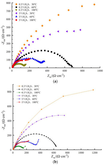 According to the fitted parameters in Table 7, it can be seen that, in the electrochemical experiments containing 0.3 and 3% Na2S.9H2O, the corrosion potential of 80S steel decreased with the increase in temperature, and corrosion current density increased with the increase in temperature, indicating that the effect of temperature on the corrosion rate plays an important role at both concentrations of Na2S.9H2O. At the same temperature, the corrosion current density increased with the increase in H2S content; however, at 100 °C, the corrosion current density decreased with the increase in Na2S.9H2O content. This was because, in the corrosive environment, where CO2 and H2S co-exist, the effect of H2S on the corrosion rate was more complicated. Hence, at lower temperatures, high concentrations of H2S accelerate the corrosion process, while at higher temperatures, H2S forms dense corrosion products on the metal surface and covers the metal surface, thus slowing down the corrosion process, at which point H2S has a corrosion inhibition effect. In addition, the cathodic Tafel slope bc was greater than the anodic Tafel slope at different Na2S.9H2O contents, and temperatures, indicating that corrosion in this environment was dominated by the cathodic reaction.