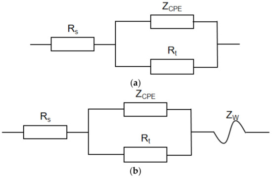 Equivalent circuit diagram for fitting the AC impedance spectrum at different temperatures and different sulfur contents. (a) 0.3%Na2S.9H2O @ 30 and 60 °C; 3%Na2S.9H2O @ 30 °C; (b) 0.3%Na2S.9H2O @ 100 °C; 3%Na2S.9H2O @ 60 and 100 °C.