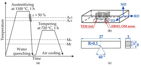 The serial tests for impact strength were carried out on small (KLST, standard NF EN ISO 14556) Charpy-type samples (with a 1 mm deep V-shaped notch with a notch tip radius of R = 0.1 mm, Figure 1c) in the temperature range −186–100 °C on the pendulum impact tester PSd 450 (WPM Werkstoffprufsysteme Leipzig GmbH, Leipzig, Germany). The samples after HTMT were cut along the rolling direction (RD) as shown in Figure 1b. The direction of the pendulum impact was parallel to the direction normal to the rolling plane (ND). At each temperature three samples were tested. The ductile-brittle transition temperature (DBTT) was determined as the midpoint between the maximum and minimum impact strength values in the studied temperature range.
