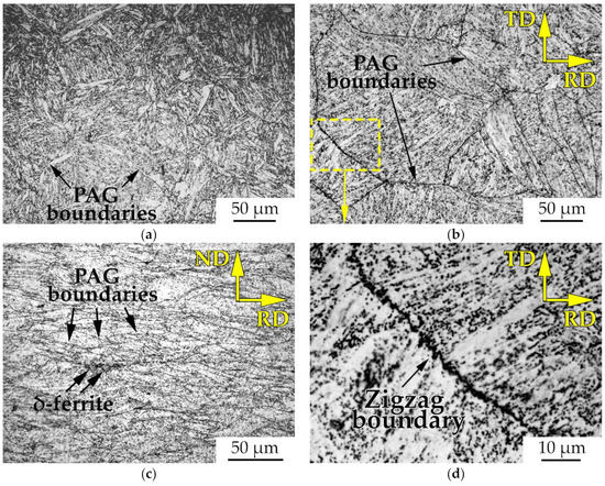 When considering the microstructure of the steel after HTMT in the transverse (TD-RD) section (Figure 2c), it is clear that the PAG is extended along the rolling direction and flattened in the direction normal to the rolling plane. That is, non-equiaxed grains are formed with an average length of ≈67 µm and a width of ≈15 µm.