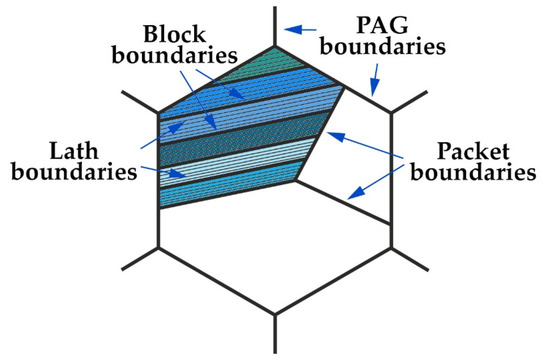 As can be seen from this figure, after THT and HTMT (TD-ND section), a typical lath martensite structure is formed (Figure 2a,b) with a high density of misorientation boundaries. It is known [27,28] that in the ferritic-martensitic steels, such structures contain a whole hierarchy of structural elements (Figure 3). Figure 2a,b show the grain boundaries of the prior austenite (PAG), inside which martensite packets are located. The packets, in turn, consist of a group of blocks with almost the same habit plane. Finally, the blocks contain the laths of martensite having a close orientation and regions of α-ferrite. It is believed [18] that the boundaries of PAG, the packets and blocks of martensite, as well as ferrite grains are predominantly high-angle, and the boundaries of laths are low-angle.