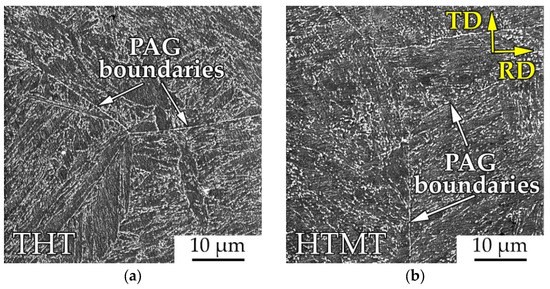 After HTMT, the boundaries of the relatively equiaxed prior austenite grains are also observed in the longitudinal section. However, there is a noticeable increase in the size of the PAG (Figure 2b), compared with the THT. In this section, their average size (diameter) is about 128 µm.