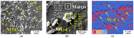 In accordance with the data of a local elemental energy-dispersive X-ray microanalysis (EDX, Figure 5b,c), the detected particles are carbides based on Cr–M23C6, which may also contain Fe, Mn, W, Si and other elements.