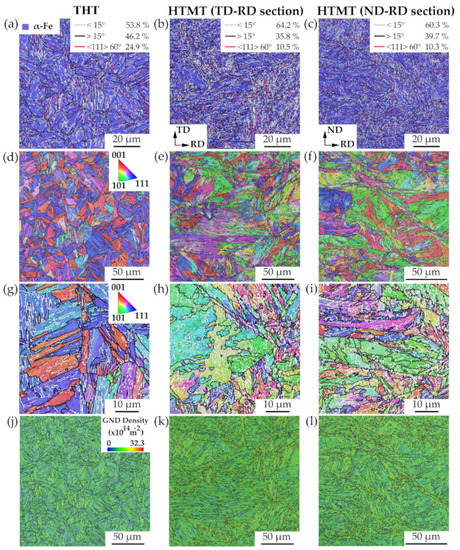 SEM EBSD images of steel microstructure after THT (a,d,g,j), HTMT in the section, parallel to the rolling plane (b,e,h,k), and in the cross section (c,f,i,l). Phase maps (a–c), where BCC-Fe is in blue color. IPF (Inverse Pole Figures) orientation maps (d–i), corresponding GND (Geometrically Necessary Dislocations) maps (j–l). High-, low-angle, and twin boundaries denoted by black, white and red lines, respectively.
