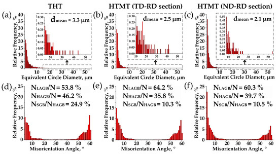 Grain misorientation distributions (a–c) and grain size distributions (d–f) after THT (a,d), HTMT in the section parallel to the rolling plane (TD-RD section) (b,e), and in the cross section (ND-RD section) (c,f). NLAGB/N, NHAGB/N, NSGB/NHAGB—fraction of low-angle, high-angle, and special boundaries (Σ 3), respectively.