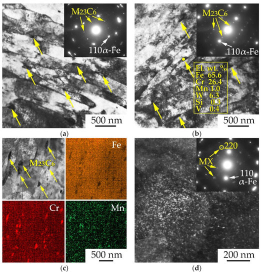 Commonly, heat-resistant ferritic-martensitic steels are complexly alloyed dispersion-hardened materials [1,5,7,10,11,12,13]. Their traditional heat treatment (THT) includes normalization (at T ≥ 1050 °C) and high (at T ≥ 700 °C) tempering. As a result of THT, a tempered ferritic-martensitic microstructure is formed with particles of the second phases: relatively coarse (from tens to hundreds of nanometers) carbides M23C6 (M–Cr, Mn, Fe, W, etc.) and nanosized (up to 10–15 nm) carbonitrides of the MX type (M–V, Ti, Ta, Nb, Mo, etc., X–C, N) [14,15,16,17]. The M23C6 carbides are usually located at the grain and subgrain boundaries. The MX carbonitrides lie inside the martensite laths and ferrite grains.