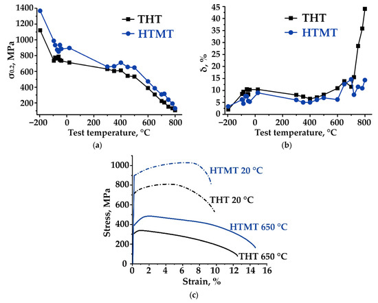 Tensile properties of EK-181 steel after THT and HTMT: curves of temperature dependence of yield strength (a) and relative elongation to failure (b), engineering stress-strain curves of samples tested at 20 and 650 °C (c).