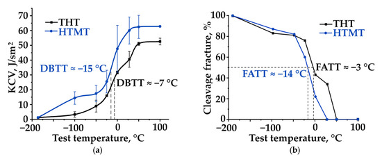 In addition, there is a decrease in the ductile-brittle transition temperature (DBTT) of the steel after HTMT (DBTT ≈−15 °C) by several degrees, compared with THT (DBTT ≈−7 °C) (Figure 10a). The impact strength (Charpy V-notch energy) at these temperatures has values of KV ≈28 J/cm2 and ≈33 J/cm2 after THT and HTMT, respectively [26].