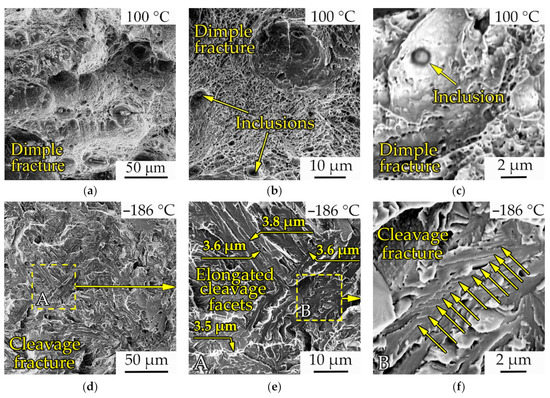 Fractographic images of the central part of steel EK-181 impact samples after THT, fractured at 100 °C (a–c) and −186 °C (d–f). Sections A and B highlighted by dotted rectangles are shown in Figures (e,f).