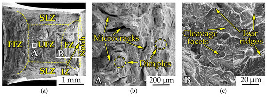 SEM images of fracture surface samples after THT after impact test at 28 °C (a) and magnified areas marked by white squares at a (b,c). IZ—crack initiation zone, FZ—fibrous zone, UFZ—unstable fracture zone, SLZ—shear lip zone, FFZ—final fracture zone.