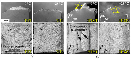 SEM images of the lateral and fracture surfaces of steel impact samples after THT (a) and HTMT (b) fractured at 0 and −25 °C.