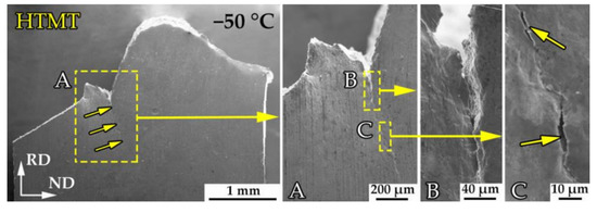 SEM images of the lateral surface of the impact sample after HTMT tested at −50 °C. A, B, C—magnified images of the areas outlined by dashed frames.