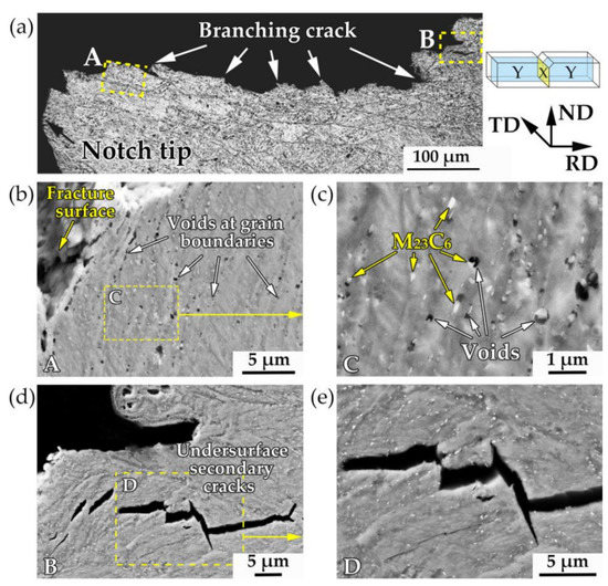 In addition, there are secondary microcracks with a length of ≈2 to 40 µm, located under the fracture surface (Figure 15d,e). These cracks are non-linear. They have a zigzag shape, which might imply their branching on hitting the obstacles. According to [18], the delamination cleavage can initiate on parallel cleavage {100} planes lying almost parallel to the rolling plane. The secondary microcracks discussed here probably originate before the front of the propagating main crack, then they can merge with it or become blunt/stop before reaching their critical size.