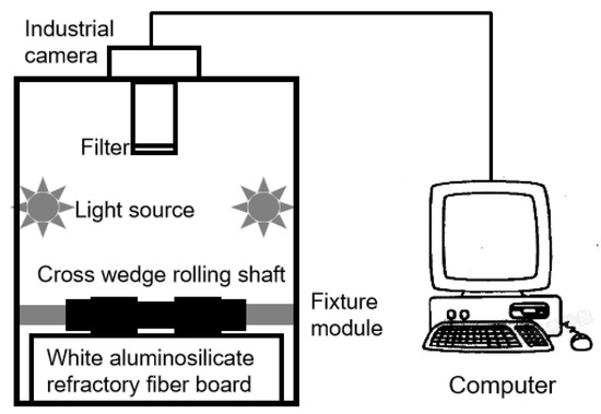 - The schematic diagram of the surface hollow defect detection system for hot-state shaft in cross wedge rolling is shown in Figure 2, and it mainly consists of the following three modules:Image acquisition module. The image acquisition module includes industrial camera and camera lens. The industrial camera is manufactured by Daheng Image Company in Shanghai, China, with the product model is ME2P-2612-4GC-P CMOS. The resolution of the camera is 5120 × 5120 pixels and its rectangular chip size (L × H) is 12.8 mm × 12.8 mm. The product model of the camera lens is DaHeng Image’s HN-P-1624-25M-C1.2/1 with focal length f of 16 mm. According to Equation (1), the field of view of the camera module can be calculated as 43.6°. Therefore, the shafts will not overflow the image boundary during imaging.