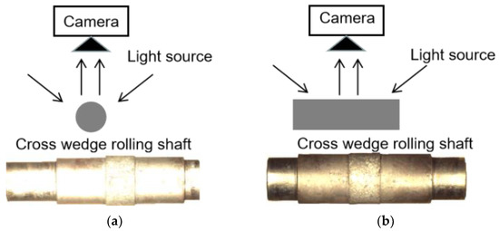 Metal shafts have highly reflective characteristics. When machine vision technology is applied to detect its surface hollow defect, the high-light noise mixed in the collected image is easy to drown useful information such as defects [15,16,17], which hinders the identification of the surface hollow defect. In order to improve the quality of the acquired image, the imaging effects of 850 °C cross wedge rolling shaft in two lighting modes, circumferential and axial light source, are compared and analyzed, as shown in Figure 3.