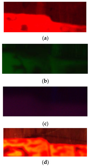 Image acquisition results with different optical filters at 800 °C without light. (a) Red optical filter; (b) Green optical filter; (c) Blue optical filter; (d) Infrared optical filter.