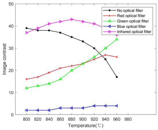 To determine the optimal filtering method, the maximum image contrast is taken as the index to analyze the influence of different optical filters on the image quality. The temperature range of the rolled shafts are concentrated in 800~900 °C. In this study, the rolled shafts are heat to 800 °C in the furnace and the industrial camera collect the images every 20 °C until the temperature reach 960 °C. Then, segmenting their image foreground and image background separately. By substituting the above two parameters into Equation (2), the image contrast can be calculated. And Figure 5 shows the image contrast results with different optical filter and different temperature. It can be seen from Figure 5 that the image contrast will drops sharply with the increase of temperature when there is no optical filter, and it will changes slowly when the camera equipped with optical filter. As a result, the application of the optical filter can effectively reduce the influence of temperature change for the captured image quality. In addition, the larger the image contrast, the larger the gray value difference between foreground and background, the clearer the contour details and surface texture in the image, which is conducive to accurate image segmentation. Through comparative analysis, the image contrast is largest when the infrared optical filter is applied. As a result, the infrared optical filter IR-CUT is used in the subsequent research.