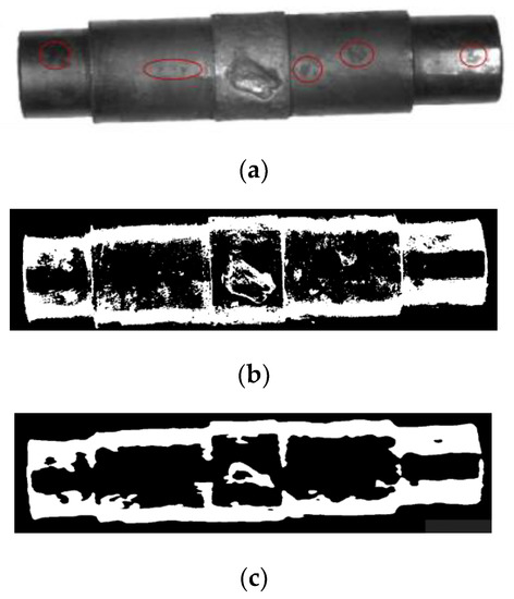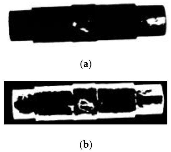 After filtering, the image should be segmented in order to extract the surface hollow defect. The Otsu threshold method and adaptive threshold method are two common methods in the image segmentation. The Otsu threshold method uses the global gray-scale average to find the best threshold value, which is sensitive to light. Figure 7a shows the acquired segmentation results by using Otsu threshold method. Where the white area in the shaft contour are two highlight areas of the defect position and the shaft axis position respectively. The adaptive threshold method divides the image into N areas, and the image in different areas will have the corresponding local threshold, which is sensitive to the surface contour. Figure 7b shows the acquired segmentation results by using adaptive threshold method. Where the white area in the shaft contour is step contour, defect contour and partial uneliminated surface texture. The surface distribution of the hot-state shaft in cross wedge rolling is complex, and the above two threshold processing methods cannot effectively extract the surface hollow defect from many noises.