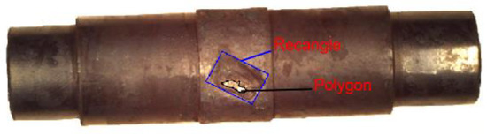 If all vertices of polygon i are located in rectangle j, the i-th white polygonal area in the Otsu threshold method and the j-th white rectangular area in the adaptive threshold method together constitute the defect area of rolled shafts. It can be expressed as Equation (11):