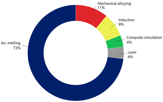 Regarding the development of bioHEAs, most of the experimental works have used melting techniques (Figure 1), as they are more suitable techniques for the fusion of reactive elements such as Ti, Zr, and Hf. Some papers have indicated that the induction technique leads the microstructure to a structure similar to that of arc melting, as is the case in a publication by Nagase et al. [11]. Techniques using powder, such as powder metallurgy and selective laser melting (SLM), are prominent routes for enabling greater structural homogeneity. In addition, the application of computational thermodynamics and ab initio calculations to predict the crystal structure and properties of HEAs is highlighted, due to the difficulty in predicting these characteristics for these alloys due to the large number of elements with significant amounts.