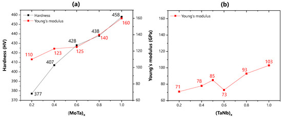(a) Evolution of hardness and Young’s modulus as a function of MoTa ratio for (MoTa)NbTiZr. Based on [41]; (b) Evolution of Young’s modulus as a function of Ta and Nb ratio for TaNbHfZrTi. Based on [23].