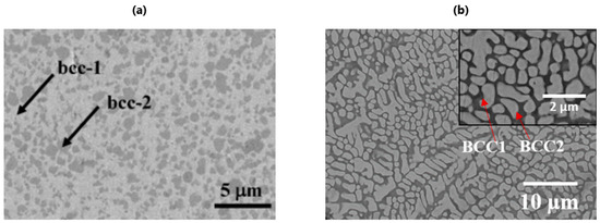 (a) SEM image showing the two BCC regions for HEA TiNbTaMoZr (from [48]); (b) SEM image of HEA MoNbTaTiZr showing the BCC1 region (dark region) and BCC2 (light region) (from [18]). Reprinted with permission from Elsevier: Mater. Chem. Phys. Copyright 2022, License: 5350300554948.