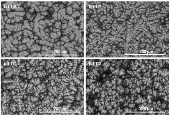 Two independent studies evaluated the influence of Ni [63] and Al [62] levels on AlCoCrFeNi-based bioHEAs produced by VAR. Rios et al. [63] indicated that the addition of Ni reduced the hardness of the alloy (from 562 to 316 HV, according to Table 7), due to the dissolution of the precipitates in a matrix rich in Ni and the formation of a solid solution. The extent of the interdendritic regions increased with higher proportions of Ni. Regarding the microstructure, the authors reported that the equiatomic alloy presented an unconventional primitive cubic phase (cP), while the others presented a fractional second-phase FCC [63]. In the work by Socorro et al. [62], for the same equiatomic alloy, the presence of the BCC phase was reported, while lower Al contents indicated stabilization of the FCC phase. On the other hand, the hardness values for the equiatomic alloy are compatible in the two works [62].