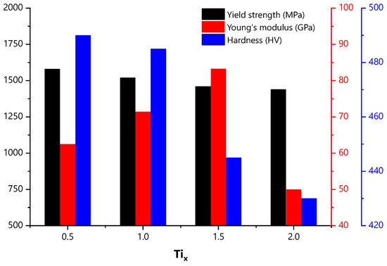 Following the same logic, the increment in the content of Ta and Nb led to an increase in the Young’s modulus of the HEA TaNbHfZrTi (x = 0.2, 0.4, 0.5, 0.8, and 1) and it decreased in only one case (x = 0.6) [23]. The values found for the elastic modulus ranged from 73 to 103 GPa (Figure 2b). Among the proportions, only the one containing x = 0.2 did not have a single BCC, resulting in BCC and HCP [23].